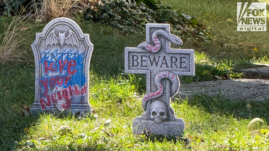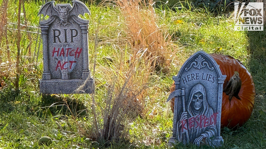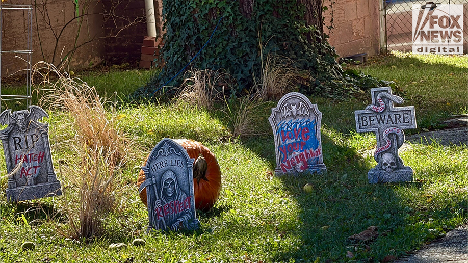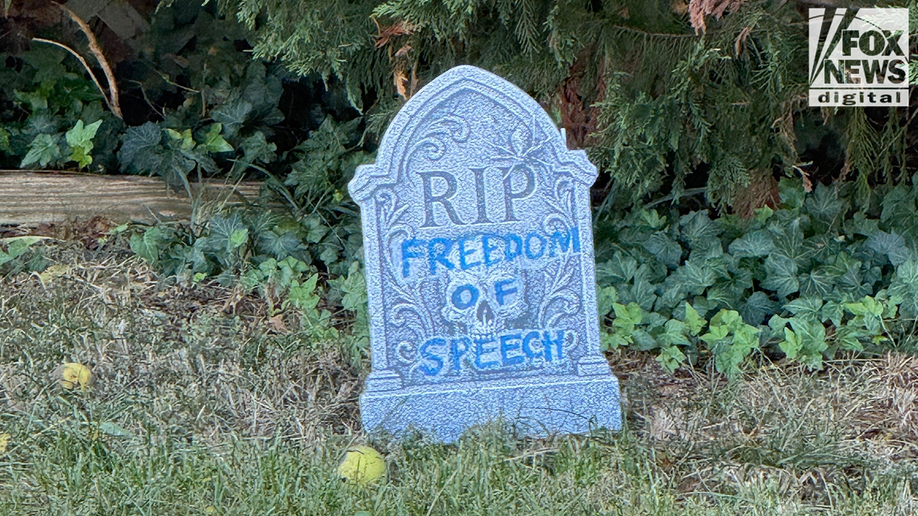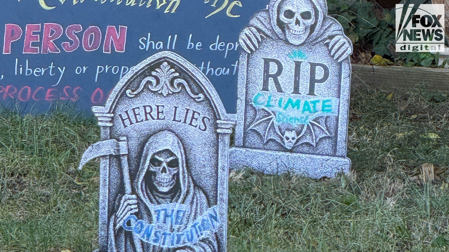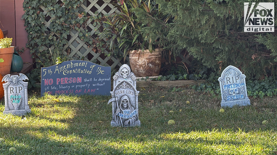 Politically charged Halloween decorations with the messages, "RIP Freedom of Speech" and "Here lies the Constitution" on display at the home of Maryland Supreme Court Justice Peter Killough. (Nicholas Ballasy for Fox News Digital)